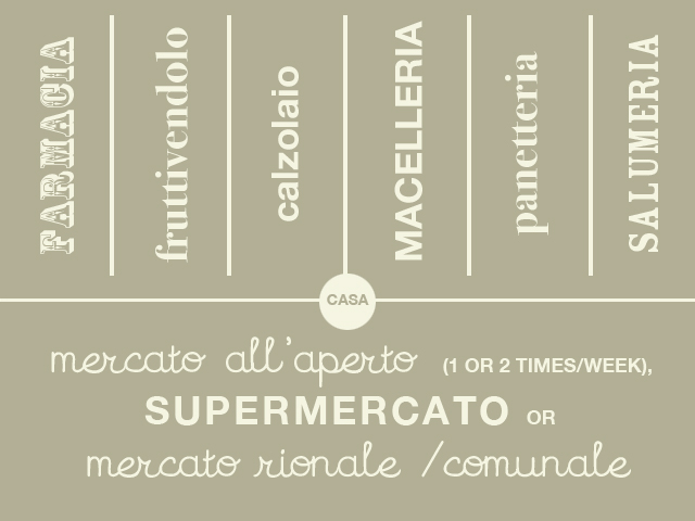 It’s called the “quartiere”—neighborhood—and, at least in the center of most Italian cities, it includes almost everything you need within walking / shouting distance. This is a truly beautiful thing, which has a profound influence on your life; i.e., you can live easily and comfortably without touching a car. But you can also carry out a multitude of entertaining and necessary transactions every single day with people you come to know and like and who know and like you (wow). Running errands is ecologically friendly and socially gratifying. Here is a schematic representation of the typical Italian neighborhood, including pharmacy, fresh fruit vendor, shoe repairman, butcher, baker salumeria (see previous post).
