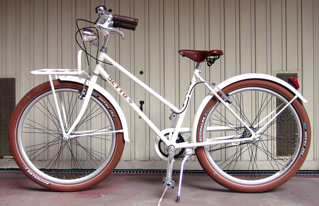 This Detto Pietro is a jazzier take on the same aesthetic, with fatter tubing and tires, luxurious leather and chrome appointments, and a front mounted basket rack. This bike “sits” like a Harley or an easy chair. No slumping forward over your handlebars. No dull ache between the shoulder blades. No stress. No bother. And equipped with a Shimano internal gear-shift, almost no sweat. Fashion accessory? Undoubtedly.
