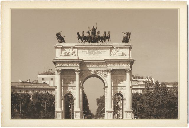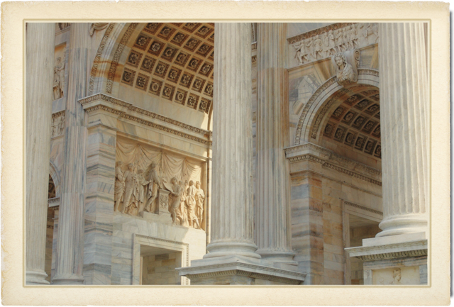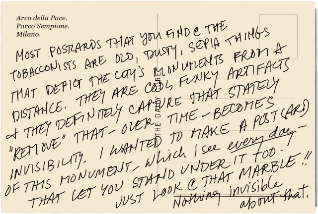 [Most postcards that you find at the tobacconists are old, dusty, sepia things that depict the city’s monuments from a distance. They are cool, funky artifacts and they definitely capture that stately remove that—over time—becomes invisibility. I wanted to make a postcard of this monument—which I see every day—that let you stand under it too. Just look at that marble!! Nothing invisible about that.]