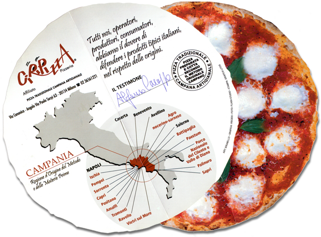 [Ciripizza. Traditional, artisinal, Campana pizza. / Campania: The region of origin of the methods and prime materials for making pizza. / All of us — restaurateurs, producers, and consumers—have the duty of defending typical Italian products, respecting the origins from which they come. / Witness: (signature, Alfonso I-can’t-read-his-last-name / Seal: Pizza prepared and cooked in accordance with the traditional, Campano method / Map.]