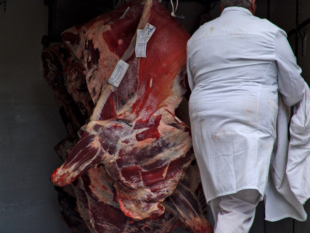 Once a week or more, the neighborhood butcher shop, Marnini, receives a delivery. A white truck pulls up. A portly man in a slightly stained white coverall slides out of the driver’s seat, opens the cargo doors to reveal several sides of beef hanging in a row, throws one over his shoulder, and hauls it into the butcher shop.