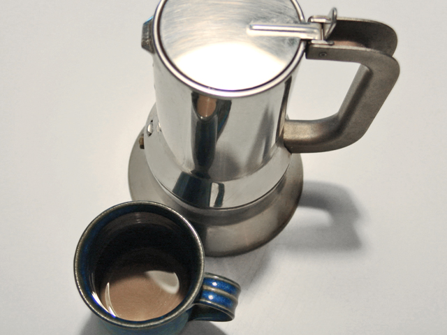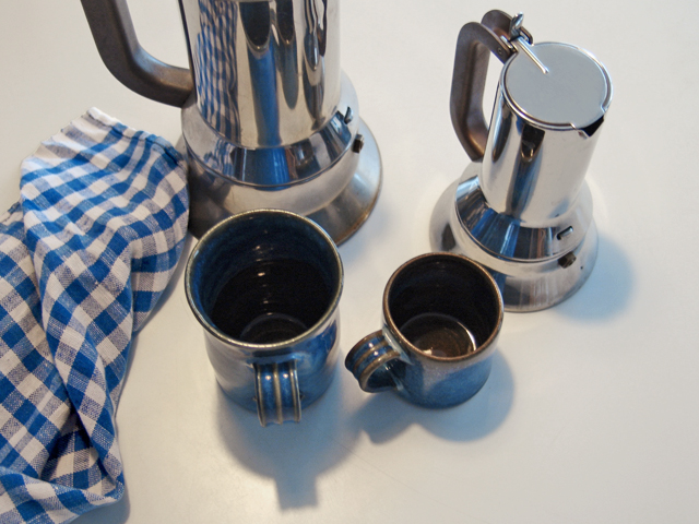 In this house, the things in question are two Alessi caffettiere (coffee makers) and two French pottery mugs. The large Alessi makes two good-sized espressi or one very abundant caffè lungo. The small one makes a single serving. They are designed identically—their tops separating from and re-attaching to their bottoms with a satisfying, well-engineered click of the handle. Their Milanese sleekness is perfectly balanced by the rusticity of the blue French mugs. City meets country. Italy meets France. Stainless steel meets clay. Coffee meets coffee cup. And thus, the long shadow of sleep meets the light of a new day.