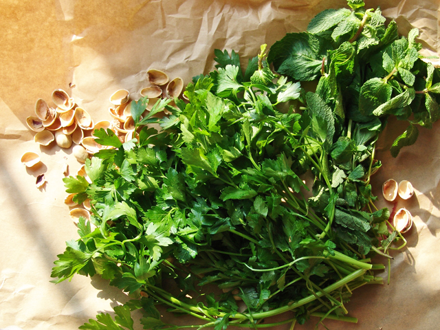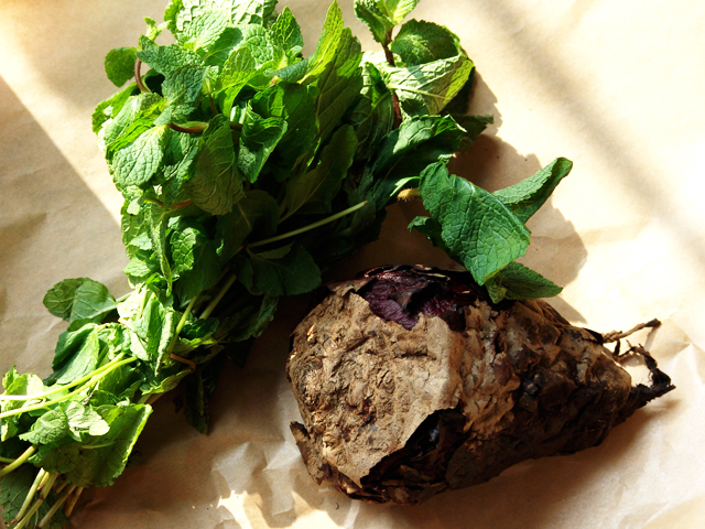 My favorite way to prepare them—I find myself actually craving this dish—is to slice them and cover them with a sauce of the following ingredients swiftly blended in an herb mill: olive oil, the juice of half a lemon, one teaspoon sugar, a handful of shelled pistacchio nuts and a mixture (to taste) of fresh flat-leaf parsley and mint. Bright and citrusy, nutty and sufficiently salty, surprising yet earthy—this is one of those rare dishes in which each and every ingredient exalts the others. And it starts with a vegetable that resembles an oversized clod of dirt. How miraculous is that?