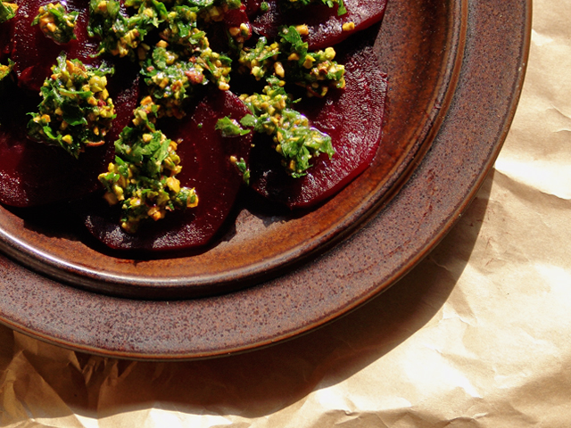 Ugly but good. A perfect description for the beet, that brute of vegetables. When young, I despised beets, and there is inside me still today a vestigial revulsion. But this feeling has evolved into a well-rounded love-hate tending mostly toward love, as I continue to experience new and exciting preparations of this ruddy root.