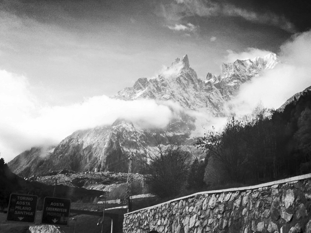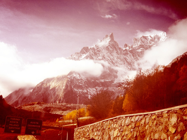 Inside the Mont Blanc tunnel, heading in either direction, we always play a game. Everyone in the car must predict what the weather will be like on the other side. As weather forecasts in France and Italy have been full of Biblical rains the past couple days, we all said, “Gray. Heavy skies. Deeply and disturbingly overcast. Raining. Cats and Dogs,”—all of us, that is, except my youngest, who cheerfully intoned, “There will be some clouds with patches of blue sky.” This comment was lightheartedly dismissed as meteorological immaturity, but the little bugger was right. When we emerged from the tunnel, the world was wildly bright and brilliant, dramatic and surreal. The wild upward tilt of the mountain against an unsettling blue sky paired with the gaudy colors of autumn was more than we could have hoped for. The “Hipstomatic” released its fake shutter with a self-satisfied chirp: “Leave it to me. I’ve got this covered.”