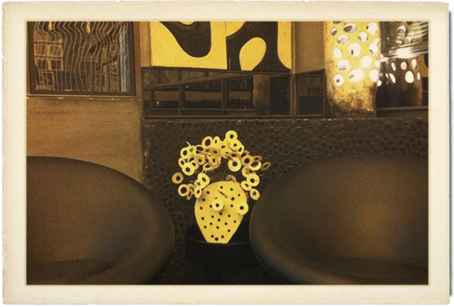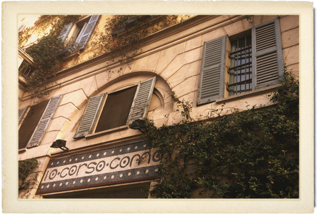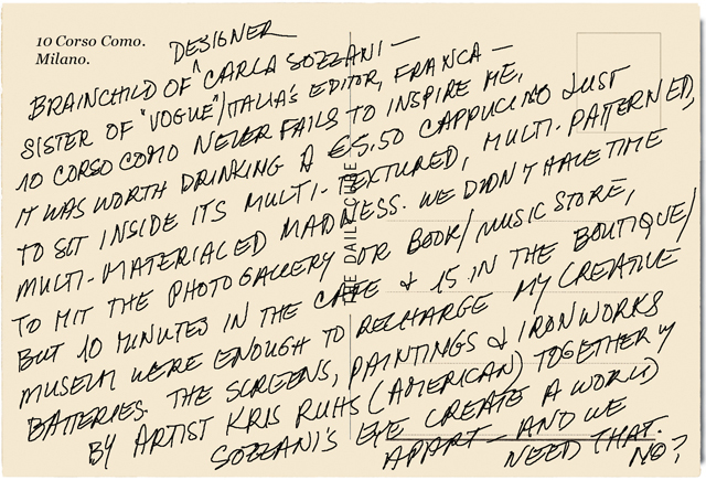 [Brainchild of designer Carla Sozzani—sister of Vogue/Italia’s editor, Franca—10 Corso Como never fails to inspire me. It was worth drinking a €5.50 cappuccino just to sit inside its multi-textured, multi-patterned, multi-materialed madness. We didn’t have time to hit the photo gallery or book/music store, but 10 minutes in the cafe and 15 in the boutique/museum were enough to recharge my creative batteries. The screens, paintings and ironworks by artist Kris Ruhs (American) together with Sozzani’s eye create a world apart—and we need that, no?]