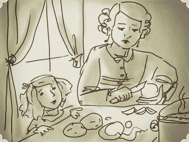 My thanks to dear friend Anna Harrison for contributing this post. I’ve had it for ages, and I’ve just now gotten around to publishing it. My apologies. It was my original intention to try and make these frites in my own kitchen and photograph the process, but I knew I would never get the flick of the wrist right. So I’ve drawn a picture instead. My attempt to capture someone else’s memory. Faulty at best, but done with love.