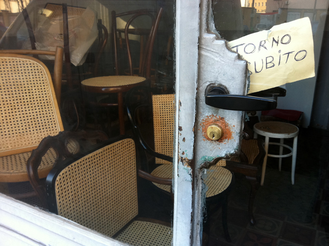 That’s why when we showed up at the laboratory of the man who re-canes our chairs, we were stymied by the sign in his door. Did he mean that he’d just gone to get a quick caffè and would return right away? (Not a very consistent behavior with this choice of profession, if you ask me.) Or did he mean that he’d gone to get a caffè corretto (i.e. with grappa) and that he’d come back when he damn well pleased? (Seemed more likely.)