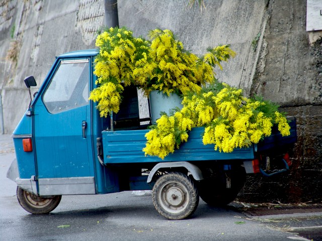 OK. Yes, technically I’m in France. But today is a special day in Italy. It’s Women’s Day. A day designated for the general appreciation of women. And the sign of this appreciation is the mimosa flower. Two weekends ago when we were in Liguria, I shot a quick picture of this ape full of mimosa by the street. The vendor was sitting out of sight, under the shade of an overhang. I set it aside for today. So, ladies, this is for you! Gentlemen, I need to research when your day is, and do something special for you as well. Stay tuned…