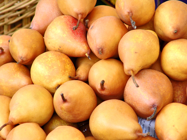 I would make melanzane alla parmigiana with a tomato salad and would cook the pears in the oven with honey. I trip to the market is always a good way to cheer yourself up.