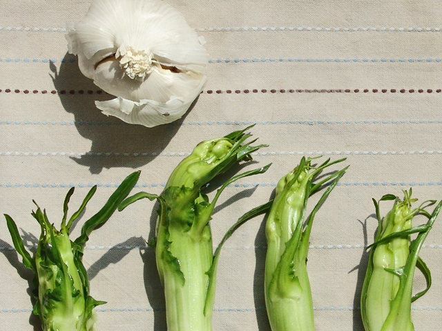 The crisp and crunchy shoots have a slightly bitter flavor, and are said to stimulate digestion and to have a diuretic effect. I believe this. There is something pleasingly challenging about eating them in their unadorned state, and that being the case, they should be good for you. But the challenge—for me, at least—ceases to exist when they are prepared in the Roman fashion: tossed with olive oil, vinegar (some recipes call for white wine vinegar, but I use balsamic), finely chopped garlic, minutely diced anchovy (it’s worth it to get the best your money can buy), sea salt and freshly grated pepper.