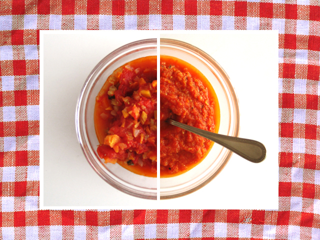 Ingredients for 4-5 people: (to use with pasta, gnocchi, rice, etc., or as a base sauce) a generous 2 pounds of fresh pear-shaped, or oblong tomatoes (about the length of your index finger or thumb), 50 grams of butter (I use olive oil), 1 stalk of celery, 1 carrot, 1/2 an onion, several leaves of basil, salt, pepper. Process: Dunk the tomatoes quickly in boiling water, then remove, rinse in cold water and peel. Remove seeds. Sauté in the butter (or oil) the finally chopped celery, carrot and onion. Add the tomatoes together with basil, salt and pepper and let the mixture cook over medium heat for 35 minutes or so, stirring from time to time. You can use the resulting sauce (below left) as is or, as is more commonly done here, passed through a manual food mill (below, right). Bon appetito.