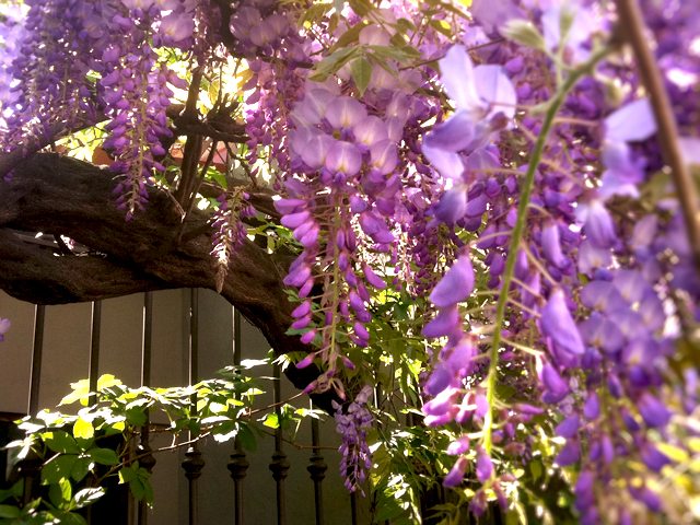 Wisteria (glicine, in Italian) doesn’t have a ubiquitous presence in this city, but it appears here and there, usually rising from the ground in ancient trunks and hanging from balconies and architectural overhangs in dense, theatrical swags. It perfumes the air, shades pedestrians, and softens whatever surface hosts it.