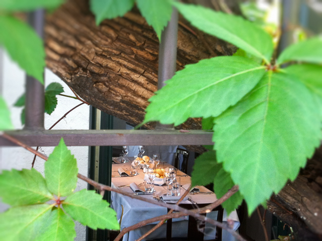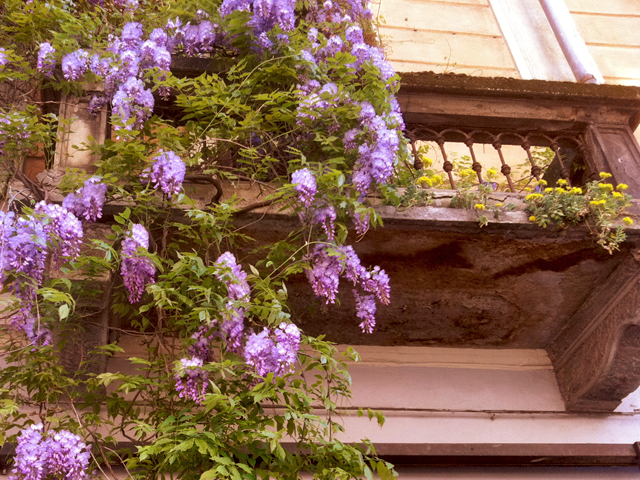 There’s an enormous vine across the street from our house, clinging to an old building that houses a restaurant (Trentino cuisine) on the ground floor. The vine rises next to the dear, little eatery in two or more intertwined trunks, and rises up to the fifth floor, taking over balconies and downspouts in its climb up. I look at it everyday now, knowing that sooner than I’d like, the beautiful flowers which hang like phantom bunches of grapes, will wither and blow away. I thank it for dressing the stage of my continual comings and goings with an unabashed romance befitting the reason I came to this city in the first place: Love.