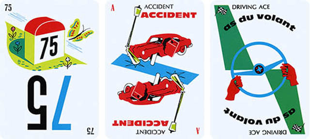 The game was invented in 1954 by Edmond Dujardin (original box above) and redesigned in 1960 by graphic designer Joseph Le Callennec. It is this design (also above) which you see on the cards today. In that same year, however, a special, limited edition (below) was designed that is more abstract and very beautiful. (We were born into well-designed times, were we not?)