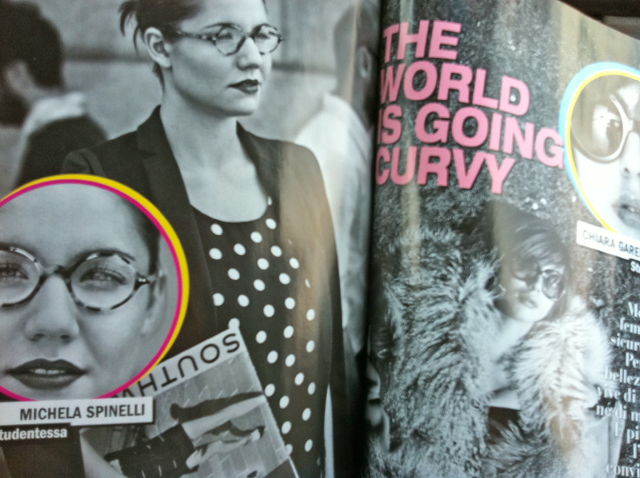 The third story was about eyewear: the comeback of roundness in glasses. Here too, without exception, all the women were healthy samples of the female animal. And at no point did I look at the spread, even with my art director’s eye, and yearn to see something with less heft. No, this is a good move. Now, sadly, I’m sure they’ll return to business as usual, but at least the statement was made. I wonder how many saw it and “listened.”