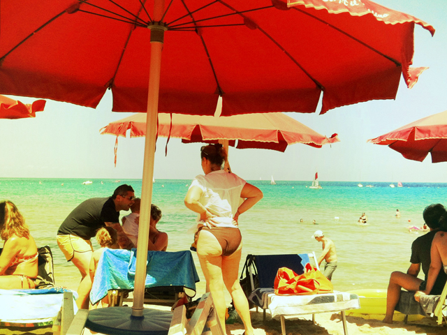 For me, the bagni, more than anything, resemble 747’s or movie theaters (right before the flight or movie has begun. There is a non-stop festive milling about—families attending to their needs, each feeling privately invisible within the sphere established by its one or two umbrellas. Couples canoodle. Bikini tops are dropped. Diapers are changed. Summer homework is done. Novels read; crosswords completed or tossed down in frustration.