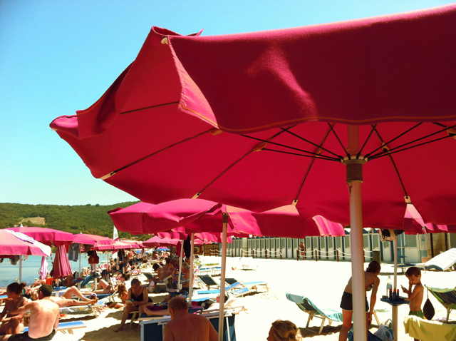 Sometimes, for a change of pace, it’s nice to take the more traditional route and make use of i bagni at the beach. While I definitely prefer the Mediterranean Sea in its naked, for-the-most-part un-art-directed form (please see “Now that’s a swimming pool“), there’s an anthropological pleasure in joining the masses (German, English, Italian, Rumanian, Austrian, Swiss, some Russian) under the umbrellas of Italy’s miniature kingdoms by the Sea.