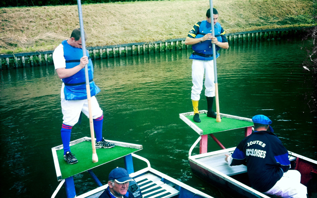 Year round, moored in the river, mostly unused and waiting, are two small punts—one blue, one red—each with a raised platform at one end. On one side of the prow is written: “You will go.” Tu iras. On the other side is written: “So will you.” Toi aussi. These are the fighting words of la joute nautique—acquatic jousting, and these are the jousting boats. Yesterday was the day they’d been waiting for.