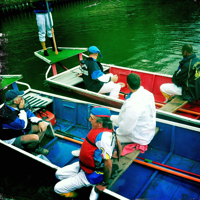 The sport is a bi-polar mixture of slow-moving boats and endless minutes of preparation punctuated by the bizarrely thrilling instant of impact followed by a brief above-board struggle and the inevitable splash of one-man-down. Each contender dons a thick pad to protect chest and guts. He (or she) then stands on the platform of his boat preparing mentally for the coming confrontation. As the boats approach each other (here they are propelled by motor, in other towns by rowers) the jousters assume the elegant lunge of a fencer. The lance arcs out over the water, planted firmly against the hip of the jouster and supported by one hand only. Faces are stern. This is a time for concentration.