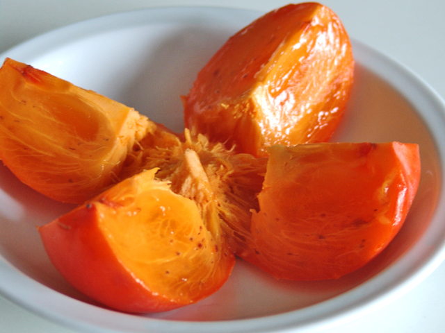 The persimmon is flipped upside down so that it’s sitting on its leaves. Then with a knife, you make two perpendicular cuts across the flesh, so that it falls in four even quadrants, skin-side down. That’s it for the knife. Next, you pick up the spoon and scoop out the delicious, sweet, almost gelatinous flesh. Every time I eat this fruit, I experience something close to ecstasy. And every time, I think, “Who needs dessert when there’s this?” Cold, it’s utterly sinful. My neighborhood restaurateur likes to offer it with Grand Marnier poured on top. It’s almost gilding the lily, but, yes, it’s damn good.