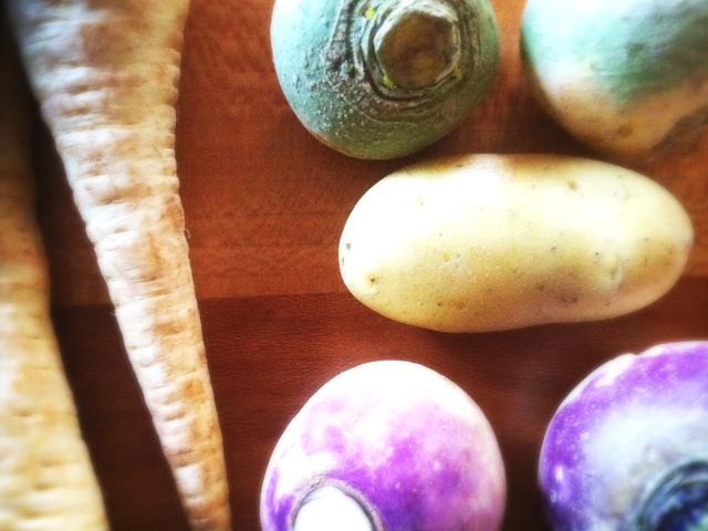 Browsing the grocery store produce department the other day, I ran into some of them—winter vegetables that are hard to come by in Italy at all. It takes cold and a “cold culture” to know and love these knobbly edibles: parsnips, rutabagas, and turnips. I’ll be chopping these up together with onion, leek, garlic, carrot and Charlotte potatoes, then roasting them for 50 minutes or more in a hot oven, with a drizzle of olive oil, a sprinkling of sea salt and a sage leaf or two. (The rosemary died. Otherwise, I’d use that.) I’ll toss once or twice during the roasting so that all the edges begin to take on the color of caramelization. Then I’ll tuck into that root-y, underground world of earthy tastes: surprising sweetness, a small nip of bitterness, and that something wonderful in rutabaga, garlic and parsnip that bites back.
