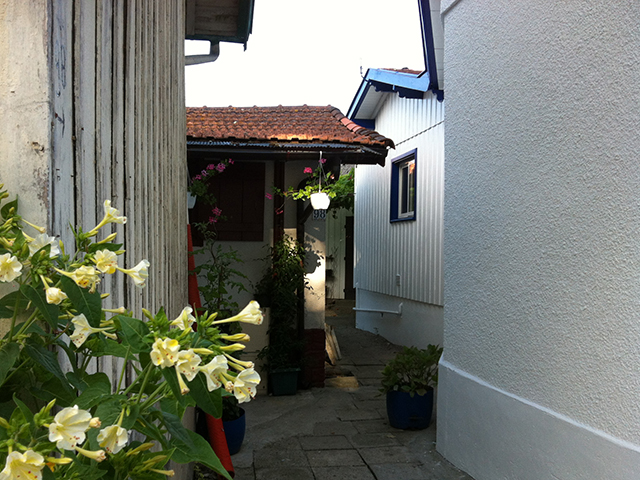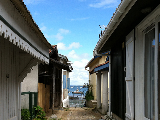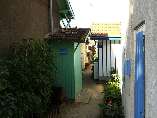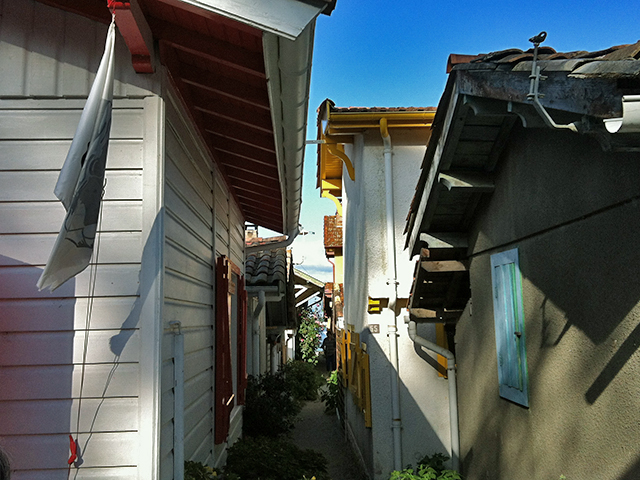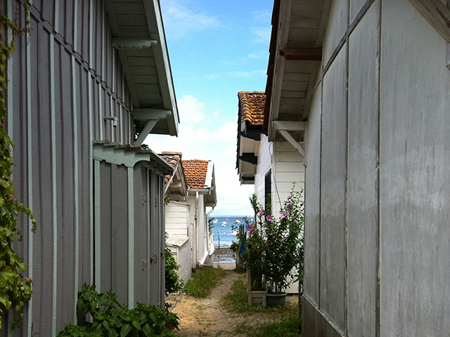 I know, I know. I’m such a one-trick pony. I love the same things over and over again. Can’t help it. Windows. Doors. Gates. Anything that opens out onto a larger world, or closes in on a smaller one, hinting at untold stories or other lives to be discovered. In Cap Ferret, the irresistible draw was the alleyway. Who can resist—even if privacy hums about the place like a swarm of protective bees—wandering between the weatherbeaten and color washed cabins toward a glistening bay? I couldn’t.
