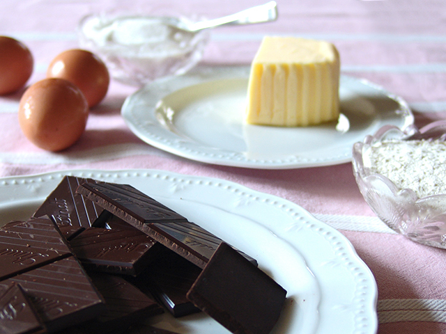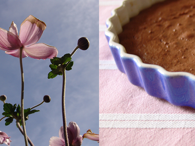 What you do next: Vigorously mix the eggs with the sugar and the flour with a whisk until the mixture becomes smooth and fluffy-ish. Break the chocolate in pieces and melt it in a double boiler. When the chocolate is melted, add the butter and allow it to melt as well. When chocolate-butter mixture is cool enough not to cook egg mixture, add it gradually to the latter, stirring constantly. Pour batter into a buttered cake pan (I use a tart pan so that I can make sure every piece I cut is the same size. My daughters measure such things to make sure I’m being “fair”). Cook for 10 minutes, during which time you can ponder how your garden grows.