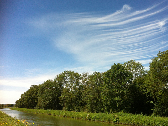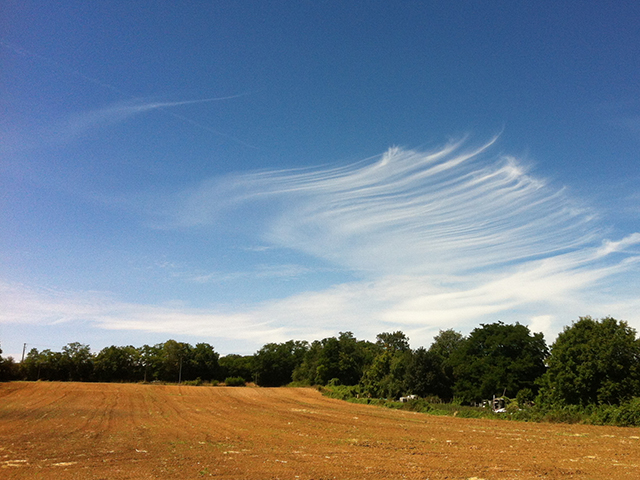 Last week before the heatwave hit, I ventured out on the bike to clear out the cobwebs and was stunned by the artistic activity on display in the sky. Someone, something, had taken out the giant paint brushes and dabbled in dry-brush technique. Here and there: wide playful swaths of white hanging in isolation against a blue museum wall. No nasty uniformed guards. No red velveteen cords. No signs saying “Don’t touch.” Because this stuff was far out of any school girl’s curious reach.