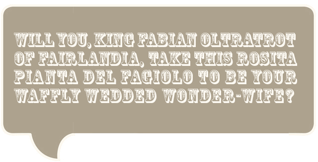 In those silly words, are hidden references to her favorite things. Fairy tales. Clarisse Bean’s dreadful teacher, Mrs. Wilberton, who famously and fatly cruises around the school on “trotters.” The tried and true wedding vow. Rosita “Bean Plant.” (We love fagioli.) The play on lawfully—”waffly” being an awfully insightful description of many marriages. And that fabulous last line, which makes even my old-married heart sing with hope and pride: wonder-wife. As if we are all wonder-spouses, despite ourselves, simply for walking into the waffly arrangement of matrimony with our eyes wide open.