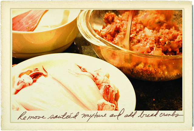 4. Remove from the flame and mix with the waiting bread crumbs. If your mixture seems overly dry to you, add a little olive oil, or water.