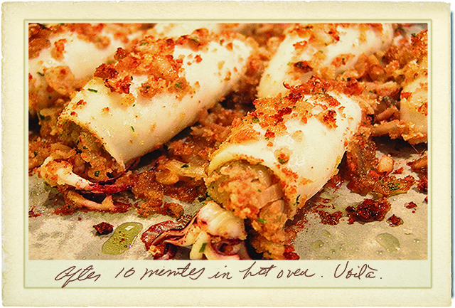 5. Stuff each empty calamaro body with the mixture, and reunite it with its head/tentacles. Sprinkle any filling that remains over and around the squids. Drizzle lightly with olive oil and place in a preheated oven for 10 minutes.