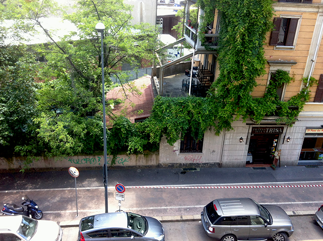Well, I am laughing over here…because the flowers are what I see FROM my balcony, they’re not on mine. Who was it that said “It’s more important that you see a house with a pretty facade than that your house has a pretty facade”? Or something like that. Milan is a total hodgepodge. Of old and new. What we think of as “Italian” and buildings that sprang up in the 60s and 70s. My house is more modern. But I get to look at this lovely sort of decrepit, ochre, wisteria draped thing every day.