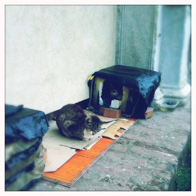They sleep in and amongst the old stone caskets that are strewn in one corner of the castle. Someone, a “woman of a certain age”—I’ve seen her once—comes to feed them. And I believe it is she who has constructed little houses for them out of vegetable crates covered with impermeable black garbage bags to protect them from the rain.
