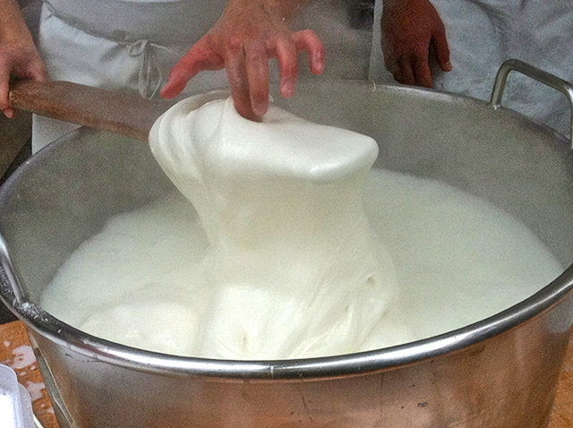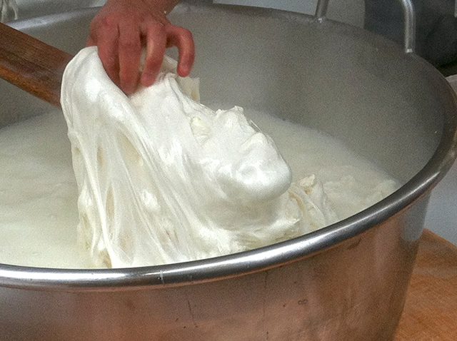 8. Occasionally test the ever-changing consistency of the cheese. Stir, pull, stir, pull.