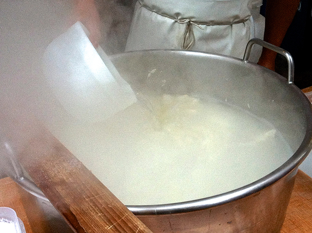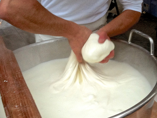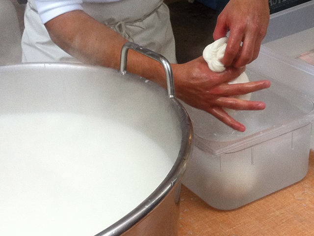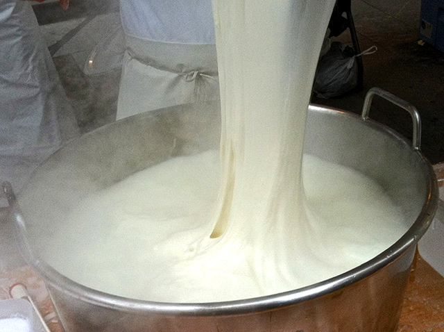 Hello, my friends. I’m back—ecco mi qua—after a weeklong trip to the U.S. plus six days (yes, it takes me that long!) to recuperate from jet lag and re-emersion into the rhythms of life with children-in-school. And what better way to nestle in and readjust then to hit a food fair on a cold, October Sunday? The excuse for the event was the ever-important Grape, but Italian edibles of every description were on hand along with music and abundant allegria. The “prize” of the day, however, goes to the young man who made mozzarella right before our hungry eyes. Here’s how you do it: