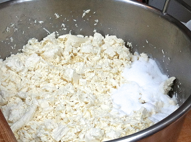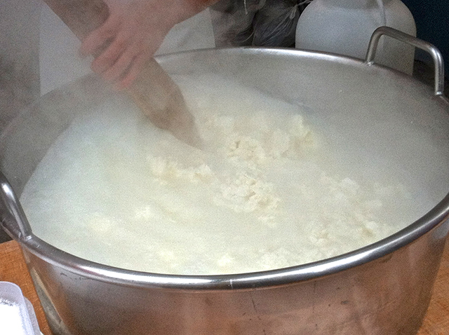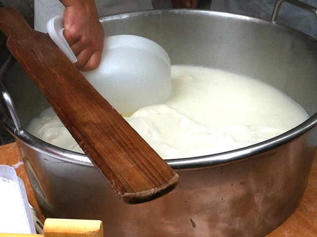 3. Plop the curd into the bowl (the product of milk and caglio or rennet).