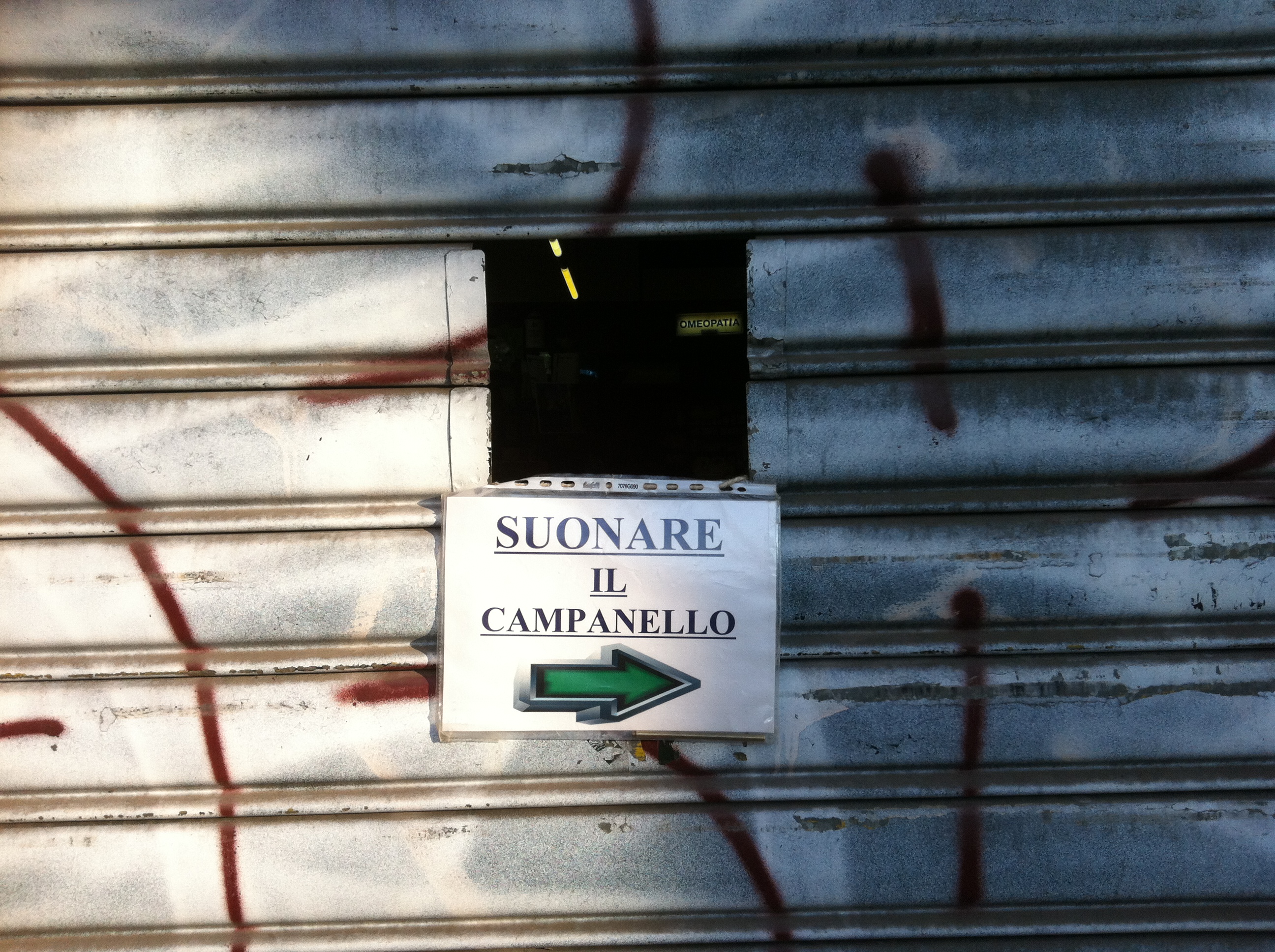 I’ve wandered off task. I wanted to talk about something which makes me laugh, and pharmacies being there when I need them doesn’t make me laugh at all. In fact, as you all know, it’s quite a relief on occasion. No. What I wanted to show you, was our neighborhood pharmacy when it’s its turn to be di turno. You’d think perhaps the door would be thrown open in a welcoming fashion with a sign inviting you in even on a Sunday, but no. It’s not like that at all. It’s like this: