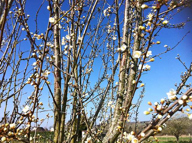 Often my answer is some shade of green. Sometimes it’s a specific shade of gray—”mouse.” Yesterday it was joyfully and unequivocally, blue. After the winter we and so many others have had, I could have added “And by the way: any blue will do. Even the smallest, weeniest littlest, palest-faced patch.” But I didn’t need to qualify it, because as we were playing this little game, the sky outside was shouting a very decisive answer of its own.