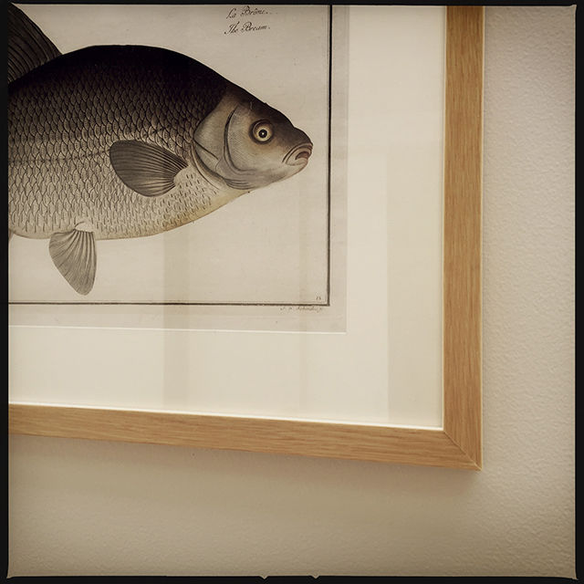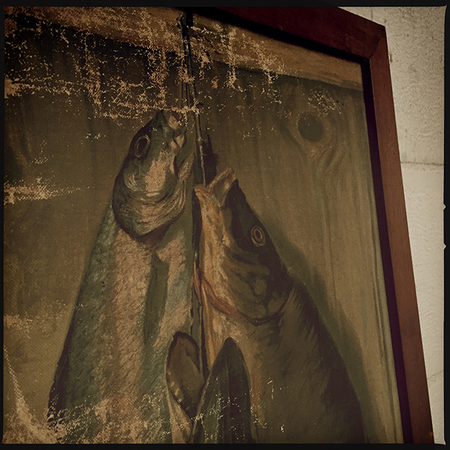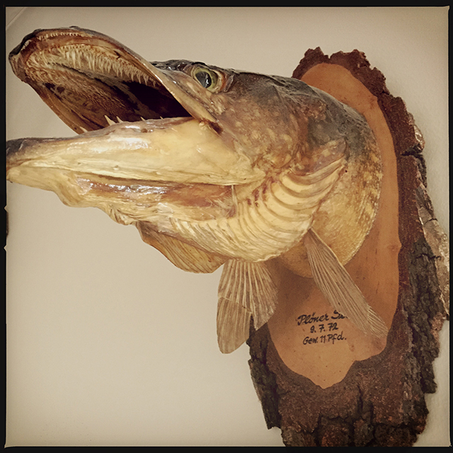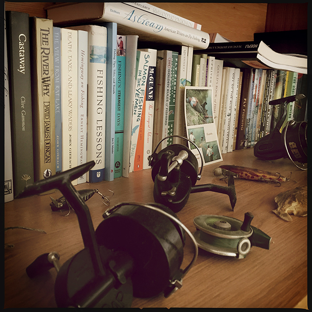 Our house is full of fishing books and magazines. Carved primitive fishes from barrier islands and third world countries. Fishing paintings and prints from God knows when or where. An antique German print I bought on Third Avenue in NYC. Fish my children painted him for his birthday before they could speak properly. Indonesian “secret message” fish. Sugar spoons shaped like fish. Bottle openers with scales and tales. Fish-adorned porcelain and plates collected at vide-greniers scattered around Burgundy. Mounted, antique pikes. Fishing rods. Reels. Bait, new and antique.
